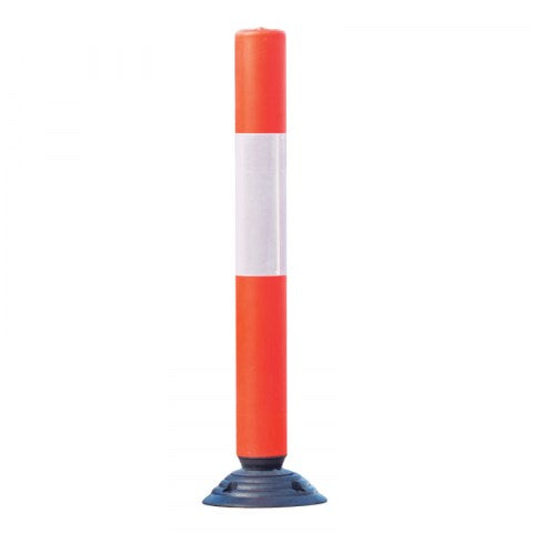 Two-piece rebound bollard with an elasticised joint for temporary or permanent delineator applications. Removable bollard post twist-locks into base. Post comes with reflective bands. The bollard is manufactured from fluorescent orange polyethylene. The rubber base is easily installed with epoxy or masonry anchors.