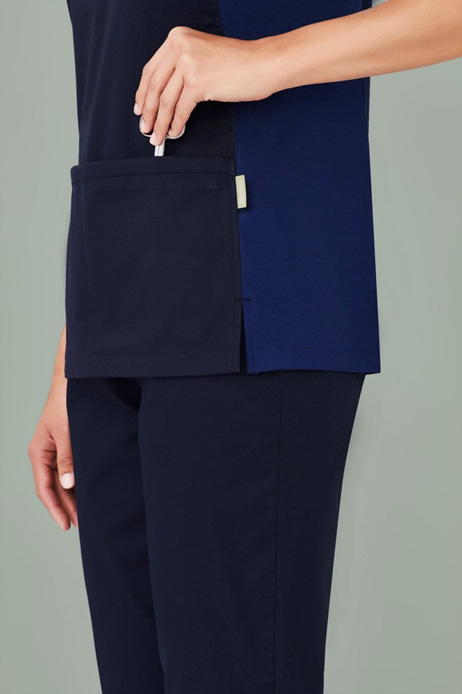 Scrub tops have antibacterial stretch side panels to provide ease of movement through the waist and arms, plus added protection of odour and bacteria control