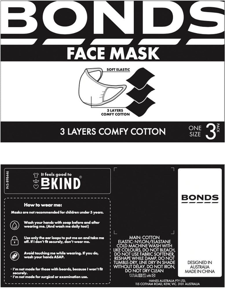 - The BONDS cotton face mask is re-usable and washable which helps provide the consumer with a sustainable product that negates the need for single use disposable masks.