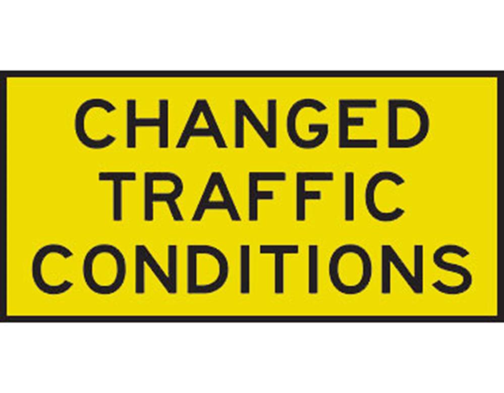 This boxed edge sign features the text CHANGED TRAFFIC CONDITIONS in large black letters on a yellow Class 1 retroreflective background.