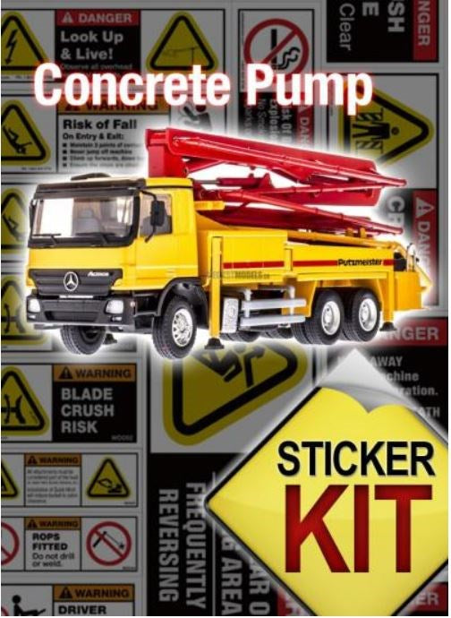 Safetysticker sheet for a Concrete Pump, contains 21 decals on sheet & application instructions all on one easy to apply sheet. These decals are additional to those supplied with the machine and include all the commonly recognised risks and hazards that are required to be labelled by local O H & S regulations. Crush zones, hot parts, pressurised system, pinch points warnings, rotating parts warnings, knock over & collision warnings, filler labels, cab warning stickers are all included. Everything you need to complete a risk assessment and have your machine meet the local OH & S standards
