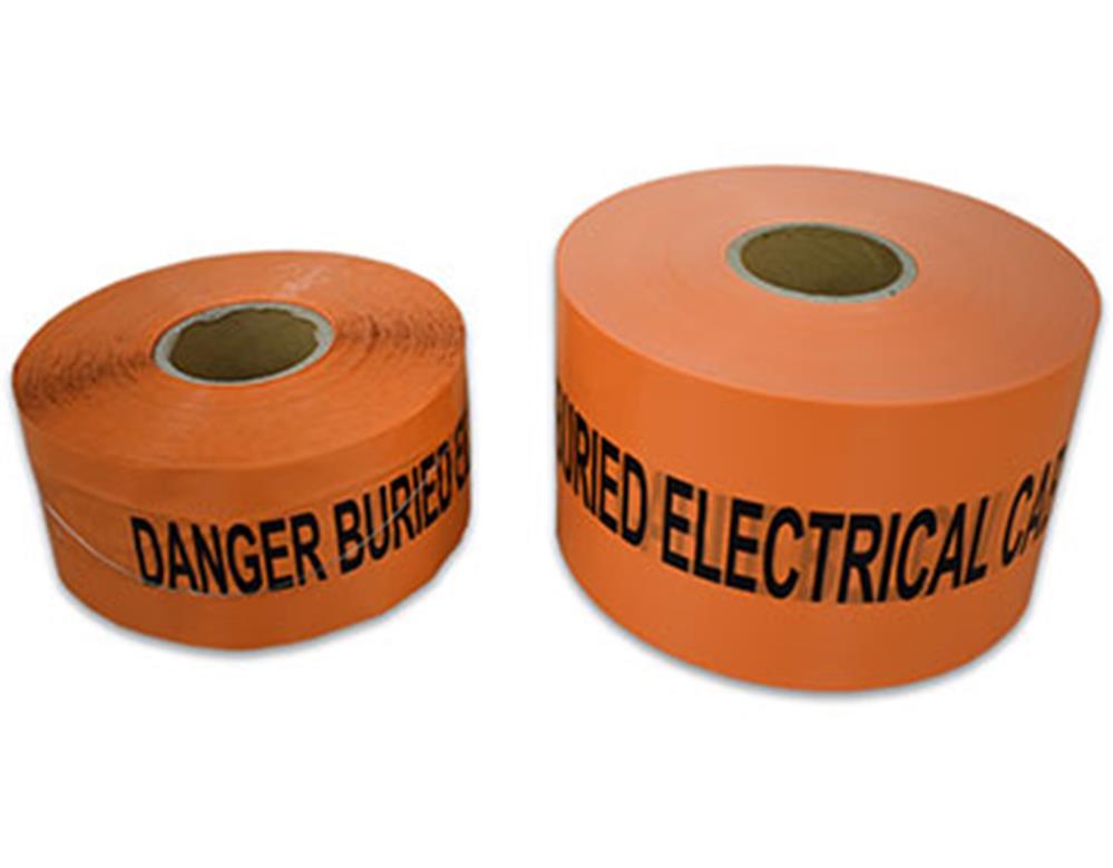 Underground electrical tape is used as a warning solution to help identify services laid beneath the earth?s surface. This orange polyethylene tape is easy to identify and has the printed text DANGER BURIED ELECTRICAL CABLE BELOW in bold, black font, repeated along the entire length of tape.