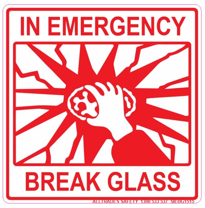 IN EMERGENCY BREAK GLASS SAFETY STICKER