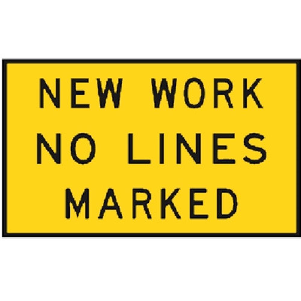 Temporary road and traffic control signage with the words New Work No Lines Marked. Measuring 900 x 1200 mm with a class 1 reflective finish.